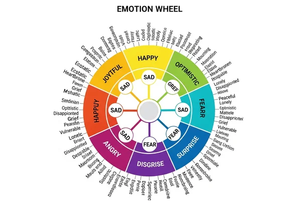You cannot express what you cannot name. An Emotion Wheel is a visual tool that breaks down basic emotions (Happy, Sad, Angry) into specific nuances (Lonely, Frustrated, Grateful).